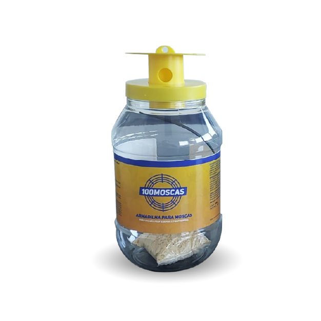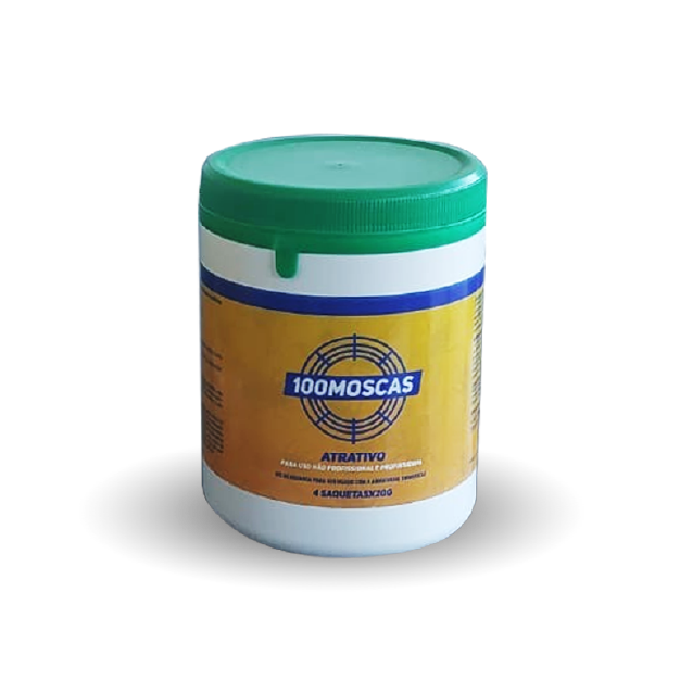 Solução composta por armadilhas e potente isco que atrai as moscas e evita que escapem. O atrativo do 100 moscas consiste num isco em pó composto por leveduras e outros ingredientes autorizados para uso dietético. A fermentação deste pó, atrai as moscas para o interior dos recipientes que formam as armadilhas. As armadilhas, por sua vez, impedem as moscas de escapar, tornado este isco altamente efi caz – reduz 80- 90% das moscas. A sua duração (até 60 dias) cria uma proteção duradoura. Este isco é livre de inseticidas (não tóxico), estando por isso autorizado para uso em agricultura biológica.