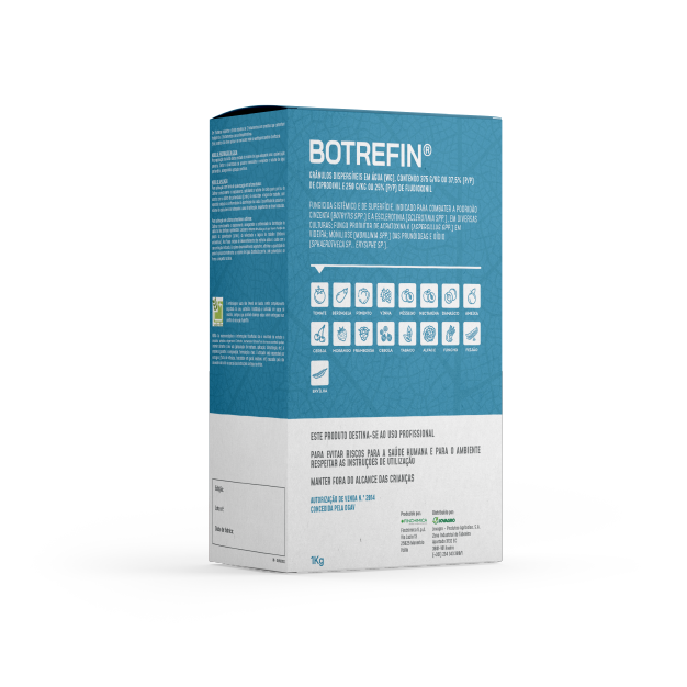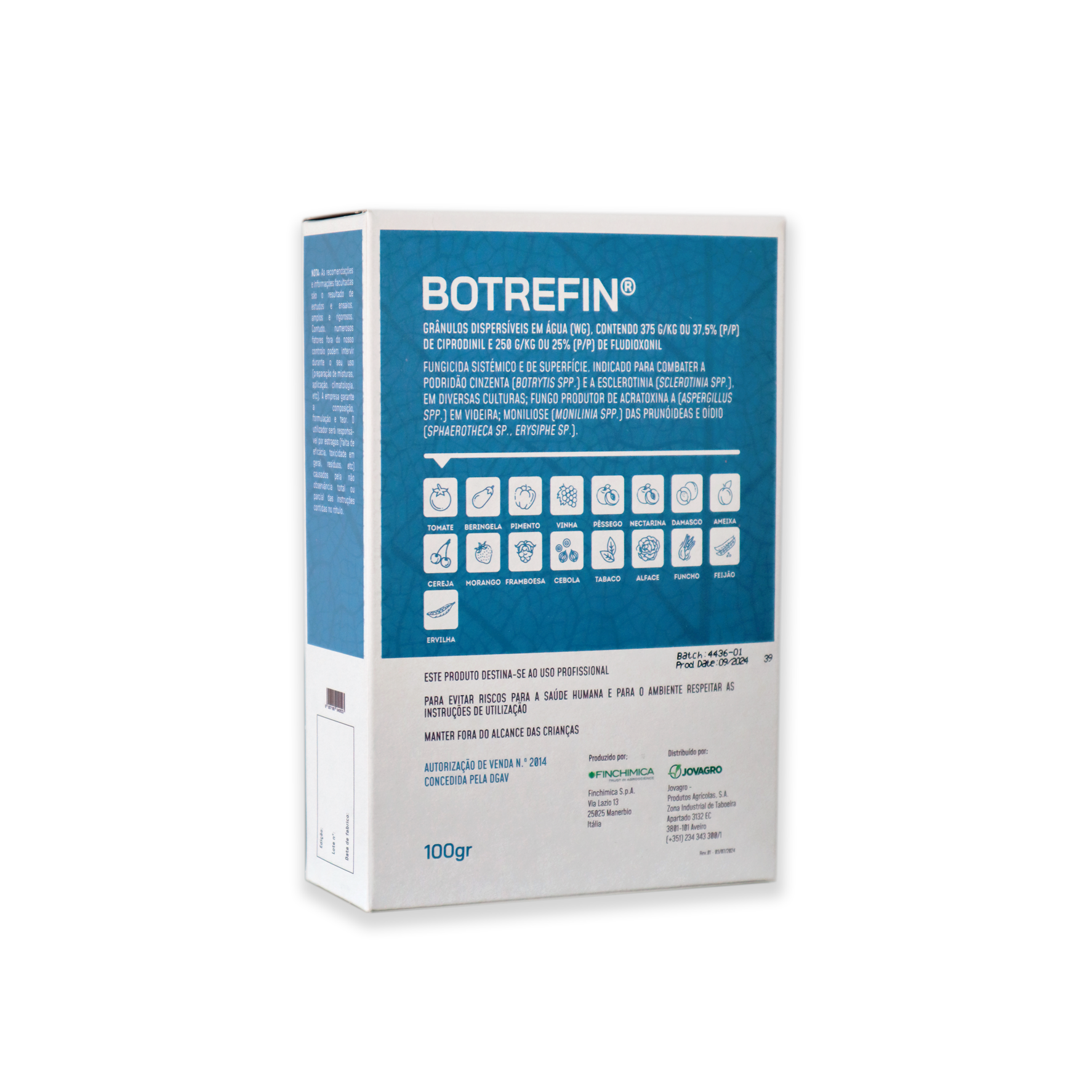 Botrefin é um fungicida com base nas substâncias ativas: ciprodinil que pertencente ao grupo das anilinopirimidinas e o fludioxonil que pertencente ao grupo dos fenilpirrole. É um fungicida sistémico e de superfície com atividade preventiva e curativa. O ciprodinil é um inibidor da síntese de aminoácidos e proteínas, atua na biossíntese da metionina e o fludioxonil inibe a transmissão dos primeiros sinais celulares, atua no sinal de transmissão osmótica da histidinaquinase.