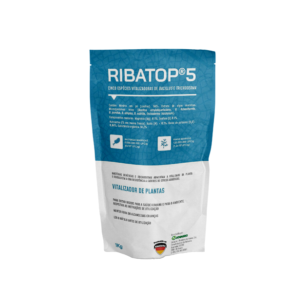Ribatop® 5 é um melhorador de solo em pó, solúvel em água, que estimula o crescimento das raízes e liberta nutrientes para as plantas. O produto contém cinco espécies de Bacillus e Trichoderma. Várias bactérias produtoras de hormonas de crescimento vegetal (giberelinas, citoquininas), como Bacillus megaterium, são combinadas com bactérias que estimulam vigorosamente o fortalecimento do sistema radicular durante todo o período de crescimento. As bactérias dissolvem o fósforo quimicamente inacessível que as plantas por si próprias não conseguem absorver. Também libertam potássio do substrato rochoso. Trichoderma estimula um forte crescimento das raízes durante todo o período de desenvolvimento. Além disso, são ferramentas indispensáveis durante a fase de germinação da planta ou durante a restauração de raízes danificadas. Os microrganismos são complementados com bioestimulantes que estimulam a divisão celular e o desenvolvimento dos botões laterais, para além disso atrasam o envelhecimento dos tecidos vegetais
